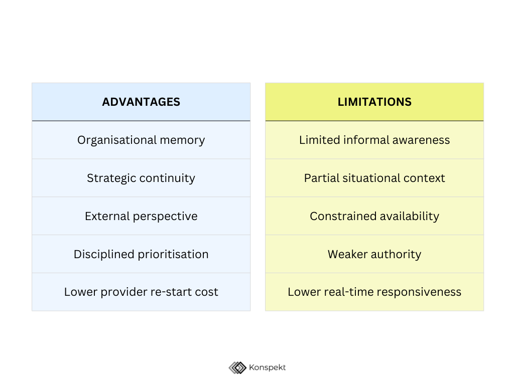 Because fractional leadership roles combine internal placement with external perspective, they accumulate organisational knowledge while remaining insulated from internal pressures.