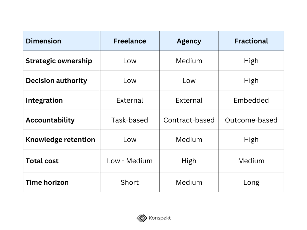 This section analyses the trade-offs between freelance, agency and fractional arrangements, before exploring how leadership needs evolve as companies mature. The focus is on understanding when and why the fractional model works best.
